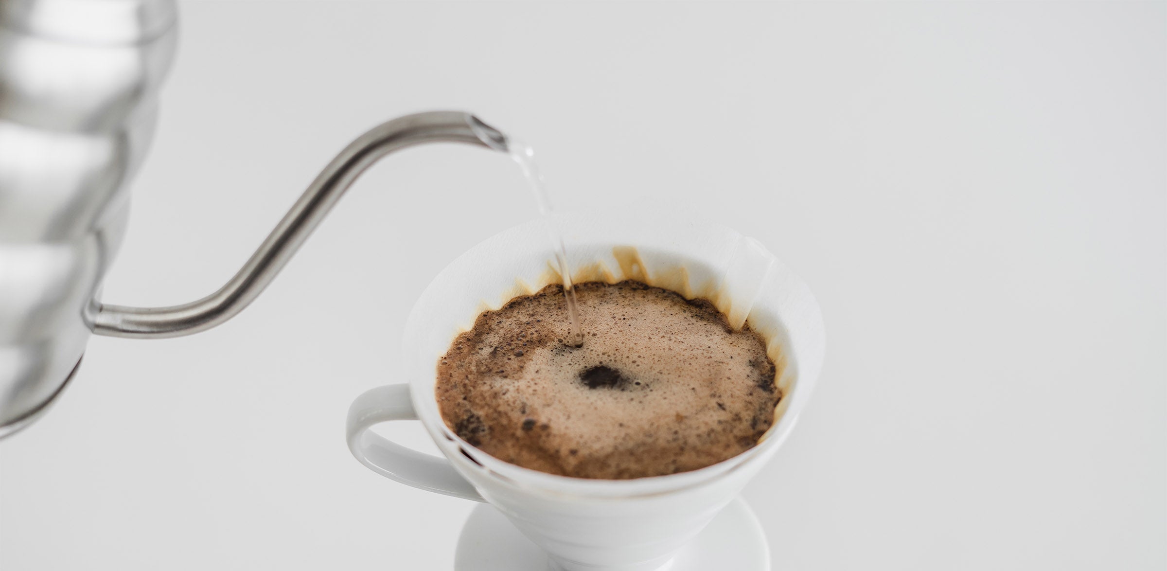 5. Start the timer and slowly pour in just enough hot water to saturate the coffee bed, moving the stream in a circular pattern be sure to saturate all of the grounds.